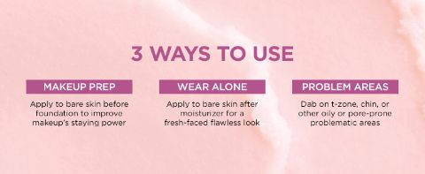 • ΒΑΣΗ ΜΑΚΙΓΙΆΖ ΓΙΑ ΤΟ ΠΡΌΣΩΠΟ ΚΑΙ ΤΑ ΜΆΤΙΑ: Εφαρμόστε στο δέρμα ή αφού απορροφηθεί πλήρως η ενυδατική κρέμα. Εφαρμόστε κάτω από τα μάτια για να εξομαλύνετε τις λεπτές γραμμές, τη μύτη και τα μάγουλα για να ελαχιστοποιήσετε την εμφάνιση των πόρων και των ατελειών στη ζώνη Τ για ένα ματ αποτέλεσμα