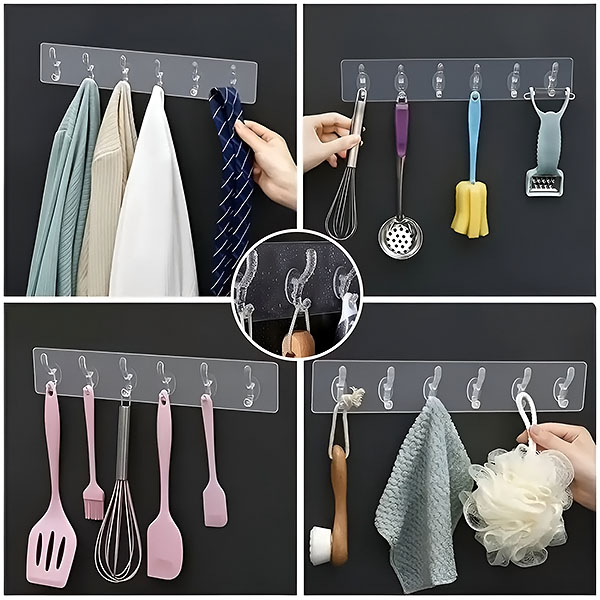 Μεταμορφώστε την οργάνωση του σπιτιού σας με αυτή την ευέλικτη αυτοκόλλητη κρεμάστρα. Με έξι ανθεκτικά άγκιστρα, είναι ιδανική για τη συγκράτηση εργαλείων κουζίνας, αξεσουάρ μπάνιου, ρούχων και πολλά άλλα.